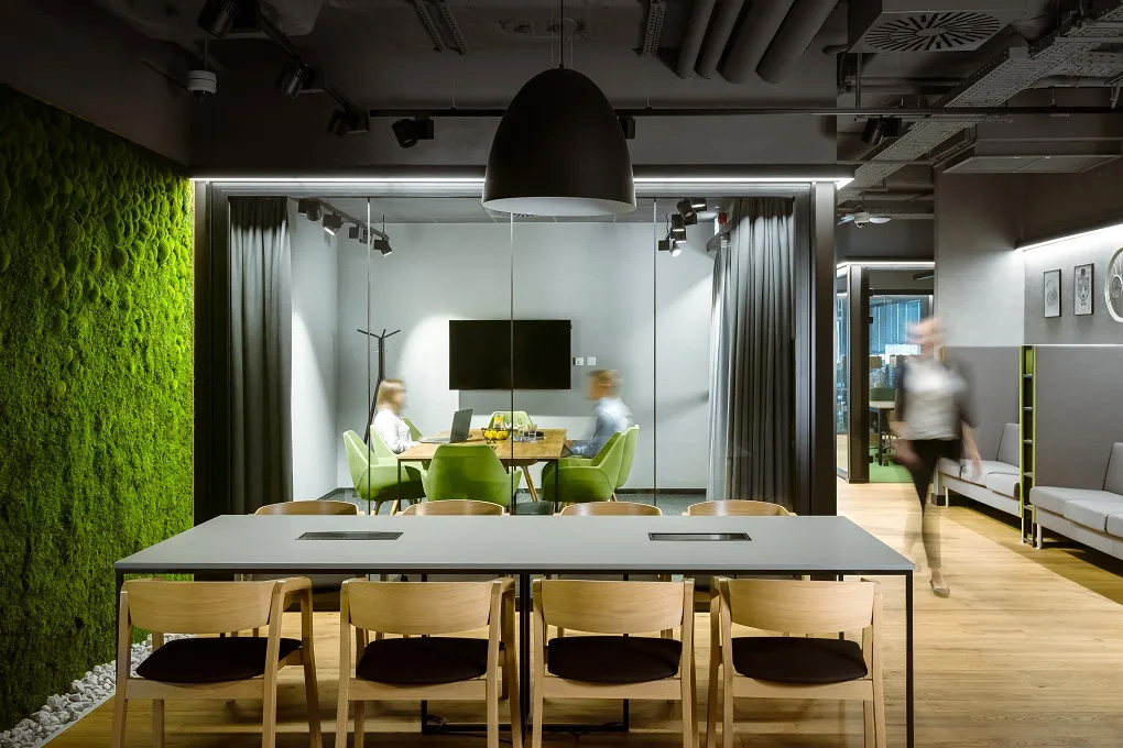 Kompleksowe biuro serwisowane – prywatne biura, hot deski, sale, strefy integracyjne, infrastruktura rowerowa.